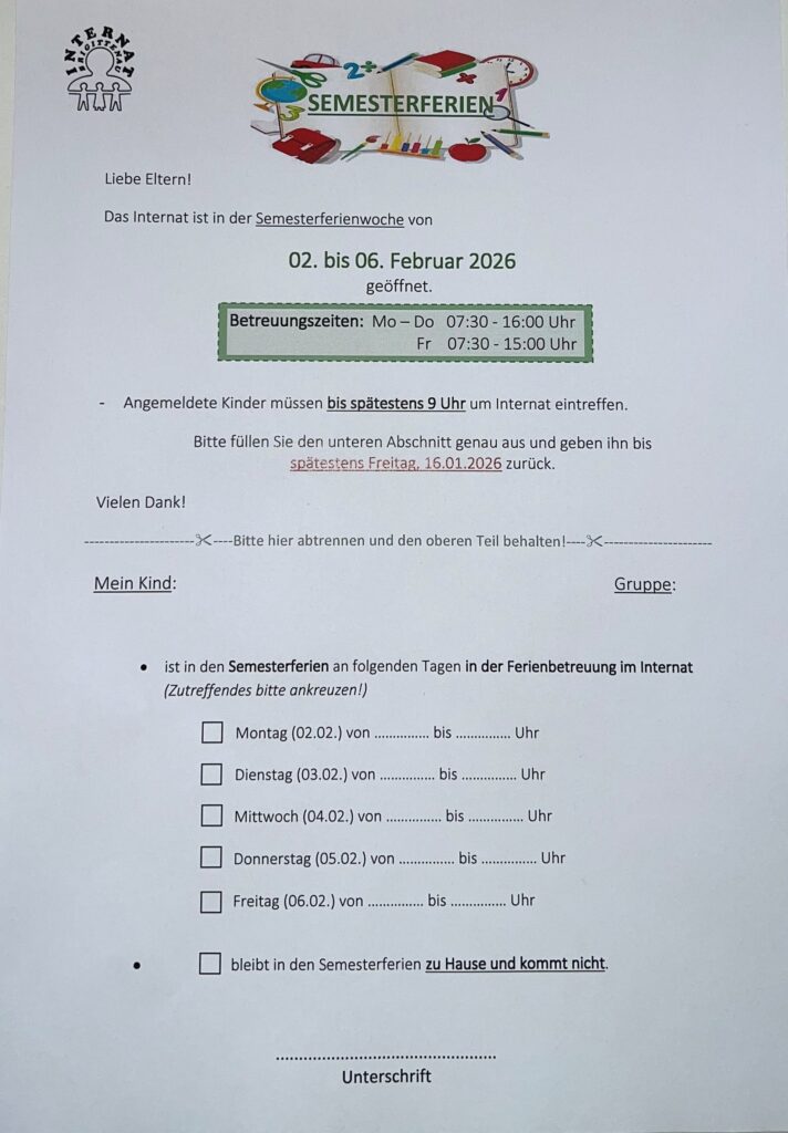 Das Anmeldeformular für die Semesterferien haben wir letzte Woche an die Kinder ausgeteilt.